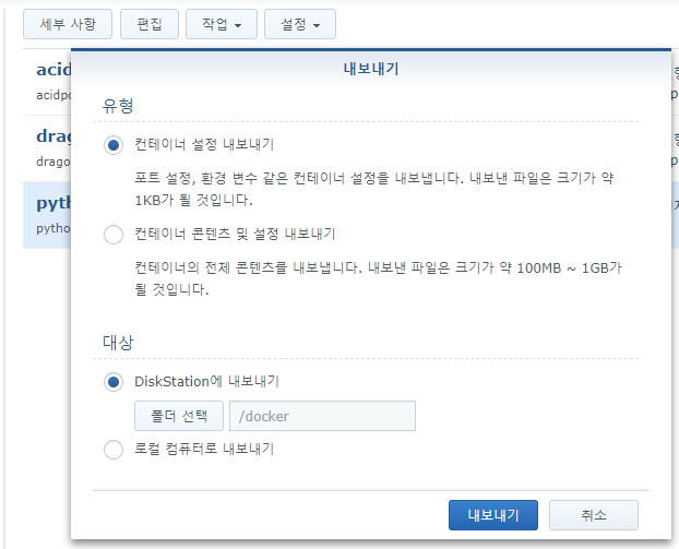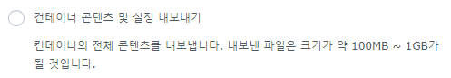 그래서 제가 처음 사용한 방법은 [내보내기]에서 컨테이너의 설정과 파일도 함께 내보내기를 하는 방법입니다.