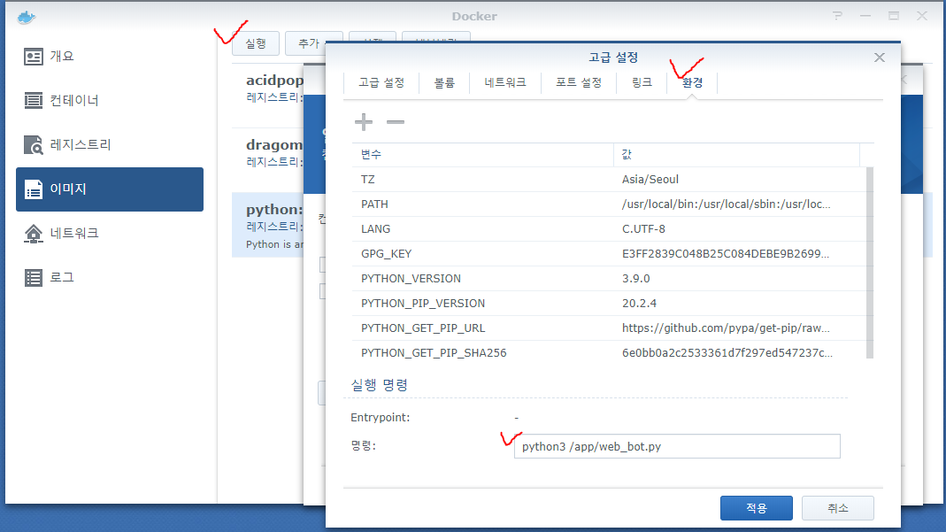 일단 Synology의 docker 앱 내에서는 이미 만들어져 있는 컨테이너의 실행 명령을 바꾸는 메뉴가 없습니다.