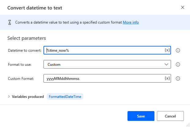 먼저 현재 시각은 Datetime -> Get current date and time 액션을 통해 변수에 저장할 수 있다.